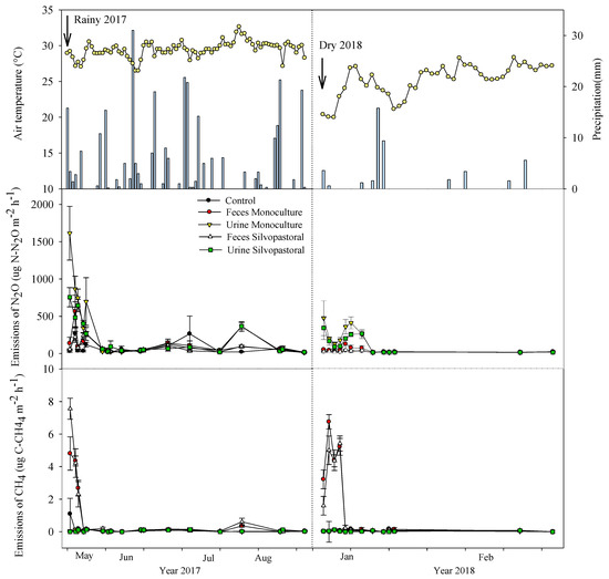 The highest daily flows of N2O occurred in the first 6 days of collection for the two systems evaluated (MS and SPS); after that period, the flows were rather low. The treatment of urine from the MS presented a higher emission of N2O, with a peak of approximately 1624 µg of N-N2O m−2 h−1 for the rainy season and 472 µg of N-N2O m−2 h−1 for the dry season, respectively. The N2O emission value in the MS stool treatment was 566 µg of N-N2O m−2 h−1 for the rainy season and 126 µg of N-N2O m−2 h−1 for the dry season—which were slightly higher than the control values. In the SPS system, the urine treatment flows were higher compared to the feces and the control, and the highest peaks were observed in the excreta of the MS.