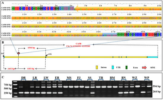Ear tissue samples were used to extract DNA using the TIANamp Genomics DNA Kit (TIANGEN, Beijing, China) according to the manufacturer’s instructions. The genomic flank regions of the SINE insertion site served as a basis to design PCR primers using Oligo7.0 software, as listed in Supplementary Table S1. The PCR amplification reaction (20 μL) consisted of 50 ng genomic DNA, 10 pmol of upstream and downstream primers, and 10 μL 2× TaqMix (Vazyme, Nanjing, China). Enzyme-free water was added to make up the 20 μL. The PCR reaction included pre-denaturation at 95 °C for 5 min, followed by 30 cycles of denaturation at 95 °C for 30 s, annealing at the primer’s corresponding annealing temperature for 30–60 s, and extension at 72 °C for 30 s. Finally, there was a further extension at 72 °C for 5 min and storage at 4 °C. Electrophoresis was used to assess the PCR product on a 1.5% agarose gel soaked in an ethidium bromide staining solution for 20 min. The gel was then put in an automatic digital gel image analysis system for photography.