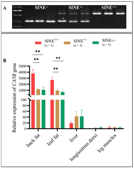 Association of SINE insertion genotype with the expression of CA5B in the tissue of adult pigs. (A) Genotype result for 9 Sushan pig individuals. (B) The results of the relative expression of the CA5B gene in different tissues. ** p < 0.01.