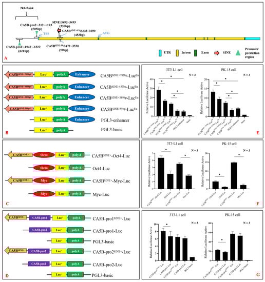 Effect of the 330 bp SINE insertion on the regulation of CA5B promoter activity. (A) The position of the promoter region in the CA5B gene was predicted, and the insertion position of 330 bp SINE was between the 3492-3493 bases. (B) Schematic diagram of the vector constructed based on PGL3-enhancer vector to explore the effect of the 330 bp SINE insertion on promoter activity. (C) Schematic diagram of the vector constructed based on enhancer verification vectors (Oct4-Luc and Myc-Luc) to explore the effect of the 330 bp SINE insertion on the activity of the weak promoter. (D) The vector diagram of the effect of 330 bp SINE insertion on the activity regulation of CA5B gene core promoter. (E–G) The results of the corresponding vectors in B, C and D by dual-luciferase reporter assay, and the number of samples in each experimental group was ran the analyses in triplicat (N = 3); * p < 0.05.