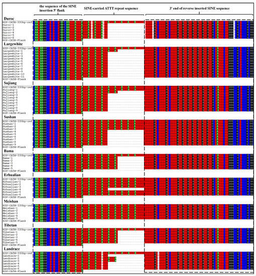 We cloned and sequenced the SINE insertion of RIP-CA5B including flanks from different genomes. The primer for this experiment was synthesized and sequenced by the Tsingke company (Tsingke, Nanjing), and we listed it in the Supplementary Table S1. We also genotyped and selected at least 5 individuals with RIP-CA5B locus of SINE insertion type from 9 different breeds of pigs. The 9 pig breeds included Duroc, Large White, Landrace, Sujiang, Bama, Erhualian, Meishan, Sushan, and Tibetan. We then cloned and sequenced the selected individuals at the RIP-CA5B locus, and we aligned the sequence results using the ClustalW Multiple alignment programs in the Bioedit software to determine the repeat number of the ATTT sequence carried by the SINE at the RIP-CA5B locus.