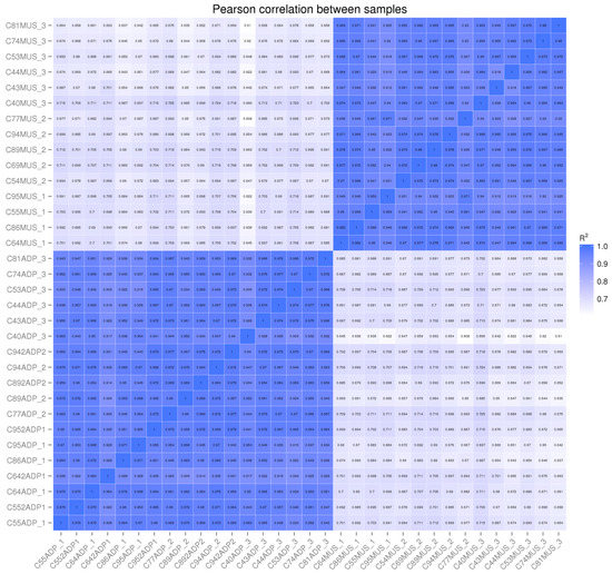 Pearson correlations between individual muscle and adipose sample FPKM value averaged across transcripts showing high correlations between samples of the same tissue and low correlation between samples of different tissues (muscle samples have an MUS appended to the animal number, and adipose samples have ADP appended to the animal number).