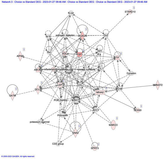 Network diagram of differentially expressed genes compared to adipose tissue from Choice to Standard quality grade samples. Items highlighted in red show higher numbers of elements in Choice than in Standard adipose samples.