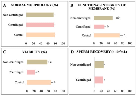 Quality and sperm recovery of collared peccary sperm separated by swim-up technique. (A) Normal morphology. (B) Functional integrity of the membrane. (C) Viability. (D) Sperm recovery. a,b: values with different superscript letters are significantly different (p < 0.05).