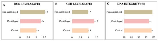 Physiological assessment of collared peccary sperm separated by the swim-up technique. (A) ROS levels. (B) GSH levels. (C) DNA integrity. a,b,c: values with different superscript letters are significantly different (p < 0.05).