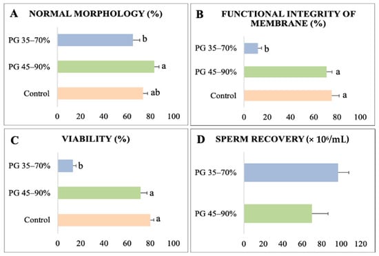 Quality and sperm recovery of collared peccary sperm separated by Percoll® gradient technique. (A) Normal morphology. (B) Functional integrity of the membrane. (C) Viability. (D) Sperm recovery. a,b: values with different superscript letters are significantly different (p < 0.05).