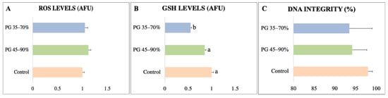 No significant increase in ROS levels was detected, whereas GSH levels decreased after the PG 35–70% separation process. Decreased levels of GSH, a main antioxidant defense component of sperm cells, indicate an imbalanced cellular defense that makes sperm more susceptible to damage from oxidative stress []. In contrast, PG 35–70% used for pig samples induced a significant increase in the percentage of mobile sperm (82.3% and 76.4% after and before selection, respectively) and improved sperm morphological characteristics []. This highlights the importance of optimizing an ideal protocol for each species, since even closed phylogenetic species show different responses.