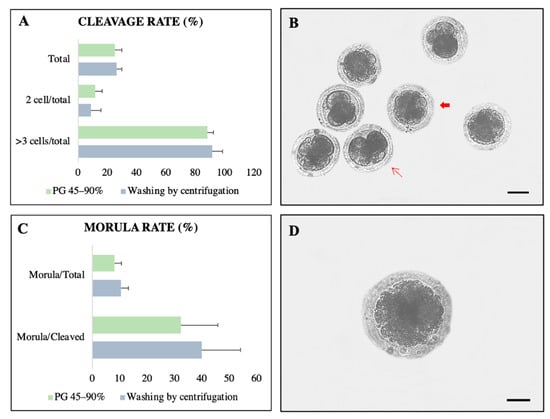 Embryonic development after heterologous fertilization of collared peccary sperm separated by PG 45–90% (n = 135 oocytes) and washing by centrifugation (n = 133 oocytes). (A) Percentage of embryos in D3 with two cells and three to seven cells. (B) Embryos two days after in vitro fertilization (thin arrow: embryo with three cells; wide arrow: embryo with more than three cells). (C) Percentage of embryos in D6. (D) Morula stage embryo after 6 days of development. No differences were observed among treatments (p > 0.05). Mean ± standard error. Six repetitions. Scale bars = 150 µm.
