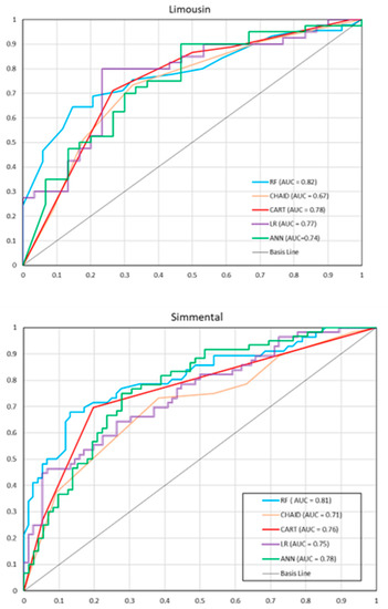 Accuracy on the test set for RF, CHAID, CART, ANN, and LR was similar and ranged from 0.68 to 0.75. Generally, it can be stated that the quality of LR, decision trees, and ANN obtained in the present study did not substantially differ from that reported by other authors. Additional analysis of the models included ROC curves and AUC. Depending on the model, this area ranged from 0.67 to 0.82. The higher the AUC (compared to the area under the line y = x corresponding to AUC = 0.5), the better the classification quality [35]. It should be noted that the obtained AUC value for the RF was the highest, although in some cases, the parameters for RF were slightly lower than those for other models (e.g., sensitivity for the Simmental breed was the highest for ANN). This suggests certain inconsistency and contradiction in recommending the appropriate model. Some researchers suggest that AUC should be considered as a secondary criterion for model selection. This would imply that for the Simmental breed, ANN would be better than RF, but on the other hand, the differences in sensitivity were not statistically significant.