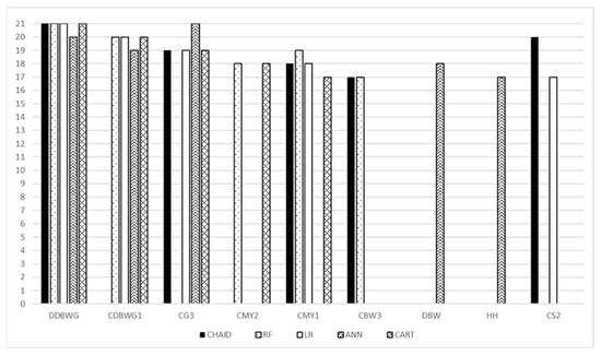 Comparison of the top five most important variables for individual models. DDBWG—daily body weight gains of the dam when she was a calf; CDBWG1—daily body weight gains for the first calf; CG3—sex of the third calf; CMY2—milk yield from calving to weaning at second lactation; CMY1—milk yield from calving to weaning at first lactation; CBW3—birth weight of the third calf; DBW—dam birth weight; HH—hip height; CS2—second calving season; RF—random forest, CHAID—chi-square automatic interaction detector, CART—classifications and regression trees, LR—logistic regression, ANN—artificial neural network.
