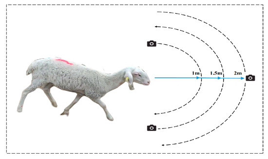 The data collected for the experiment were obtained between 8:00 a.m. and 11:30 a.m., as well as between 2:00 p.m. and 5:00 p.m., each day from 25 August 2020 to 31 August 2020. The research subjects were Hu sheep, with ages ranging from six months to two years. The number of Hu sheep utilized was 46, and the data were collected in Jinchang, Gansu Province, China. The data were obtained by recording videos (at 30 frames per second) using a Huawei Mate 30 phone camera. The data acquisition process is depicted in Figure 1. The data acquisition process was guided by three principles. First, to account for the multiscale problem, sheep face photos were obtained from three different distances. Second, to consider the different angles and postures, the sheep face was fixed at an angle and the handheld camera was used to capture images surrounding the sheep face. Third, in consideration of lighting differences, the images were captured under varying lighting conditions, including shadowed, occluded, and indoor–outdoor settings.