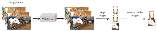 After eliminating similar images, we constructed a sheep front-face dataset, a sheep side-face dataset, and a sheep full-face dataset based on 40 randomly selected sheep to fit various experimental scenarios. These datasets consisted of 12,538 sheep face images in total, including 6269 front-face images and 6269 side-face images. The data preprocessing process is shown in Figure 3.