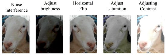 In order to improve the robustness of the model, five methods were used to augment the sheep face dataset during the training process, including noise interference, random adjustment of brightness, horizontal flipping, random adjustment of saturation, and random adjustment of contrast. The data augmentation effects are depicted in Figure 4.