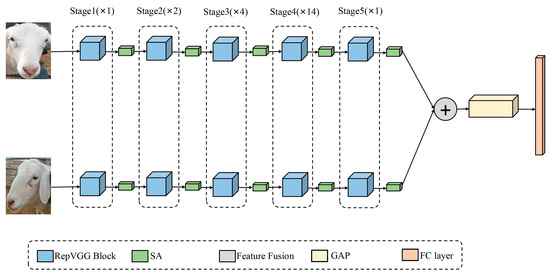 Figure 8 depicts our designed bilinear sheep face recognition model (RepB-Sheepnet). The model feeds a front-angle image of a sheep with a pixel size of 224 × 224 and a side-angle image of a sheep into the two feature extraction networks. The feature extraction network uses RepVGG blocks in five stages, where the number of RepVGG blocks used in each stage is 1, 2, 4, 14, and 1. The first layer of each stage downsamples the image with a stride of 2. After each stage, the SA block is embedded to learn and calibrate the feature information in order to improve the feature extraction effect. After the image passes through two feature extraction networks, it will be fused through the feature fusion layer to obtain a new feature, which is used as input for the global average pooling layer [35]. The role of the global average pooling layer is to reduce the dimensionality and regularize the structure of the entire network to prevent overfitting, as well as endowing each channel with the actual category meaning, which greatly reduces the number of parameters in the network. After the fusion features pass through the global average pooling layer, the sheep are finally classified through the fully connected layer.
