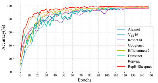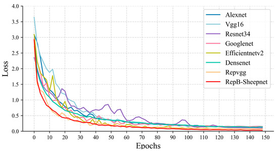 Figure 9 shows the accuracy variation of the eight models during training. From the figure, it can be seen that the accuracy of RepB-Sheepnet improves the fastest and converges relatively fast. It leveled off in accuracy after 80 epochs, while the other models mainly converged gradually after 100 epochs. Figure 10 shows the training loss of each model. It is clear from the figure that RepB-Sheepnet has the smallest loss and the curve keeps decreasing smoothly, while the other models have a large oscillation. Through these two figures, it can be seen that RepB-Sheepnet has the characteristics of fast training convergence and good stability compared to the other models.