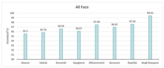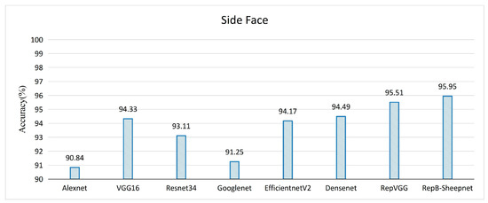 The recognition accuracy of the model was evaluated by three datasets, as shown in Figure 11, Figure 12 and Figure 13. It was found from the three figures that with the same model, the accuracy of the model tested tends to be different depending on the dataset. The model accuracy is highest using the sheep full-face dataset, and is followed by the one using the front-face dataset, while the model accuracy is worst for the side-face dataset. The accuracy of RepB-Sheepnet is the highest in all three datasets. RepB-Sheepnet achieves an accuracy of 99.43% on the sheep full-face dataset, which is the best recognition result among all the tested results.