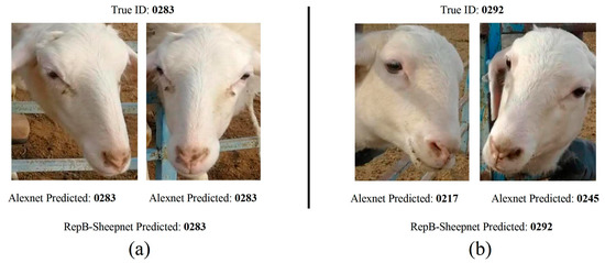Figure 15 shows the recognition results of sheep faces by Alexnet and RepB-Sheepnet. From Figure 15a, it can be seen that both Alexnet and RepB-Sheepnet recognize the sheep’s identifying information accurately. Figure 15b shows a sheep face image with a more skewed angle, and the results show that Alexnet incorrectly identifies the sheep’s identifying information. In contrast, the RepB-Sheepnet model, which uses a combination of front and side angles of sheep faces for recognition, is accurate.