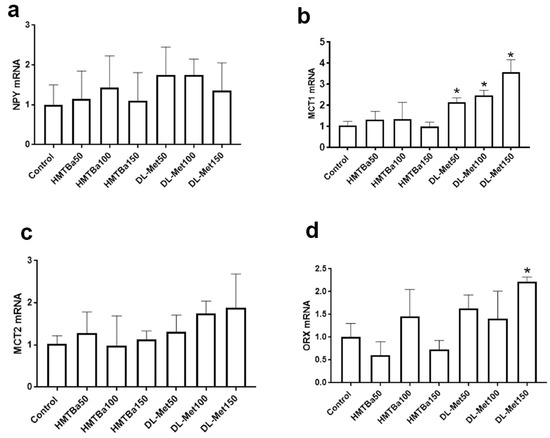 Effects of diets varying in digestible total sulfur amino acids from 0 to 35 d on hypothalamic expression of feeding-related neuropeptides. The control group was fed a basal standard diet with no source of methionine. The mRNA levels of NPY (a), MCT1 (b), MCT2 (c), and ORX (d) were determined by qPCR and 2−ΔΔCT [15]. Data are mean ± SEM (n = 6–8/group) and * indicates a significant difference compared to the control group at p < 0.05. MCT, monocarboxylate transporter; NPY, neuropeptide Y; ORX, orexin.