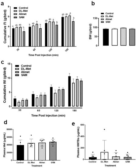 Plasma Met and HMTBa levels increased slightly in the treated (DL-Met, Alimet, and SAM) group compared to the control group, but the difference was not statistically significant (Figure 2d,e).
