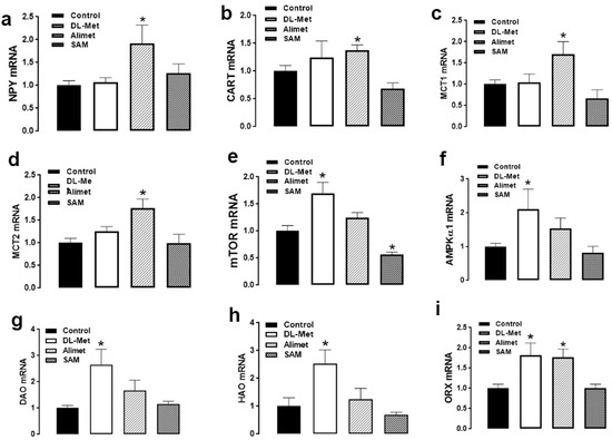 Quantitative real-time PCR analysis showed that the hypothalamic expression of NPY, CART, MCT1, and MCT2 was significantly upregulated in the ICV-Alimet group compared to the aCSF birds (Figure 3a–d). The hypothalamic expression of mTOR, AMPKα1, DAO, and HAO was significantly upregulated in DL-Met compared to the control group (Figure 3e–h). The mRNA abundances of ORX were significantly increased in the hypothalamus of both DL-Met and HMTBa groups compared to the aCSF birds (Figure 3i). The hypothalamic expression of AgRP, POMC, NPGL, adiponectin system (Adip, AdipR1, AdipR2), orexin receptors (ORXR1, ORXR2), and MCT3 remained unchanged between all studied groups (Table 10). The hypothalamic expression of mTOR was significantly downregulated in the SAM compared to the control group (Figure 3).
