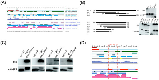 - Song, J.; Wang, M.; Du, Y.; Wan, B.; Zhang, A.; Zhang, Y.; Zhuang, G.; Ji, P.; Wu, Y.; Zhang, G. Identification of a linear B-cell epitope on the African swine fever virus CD2v protein. Int. J. Biol. Macromol. 2023, 232, 123264. [Google Scholar] [CrossRef] [PubMed]