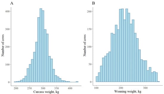 Distributions of the carcass weight (A) and the weaning weight (B).