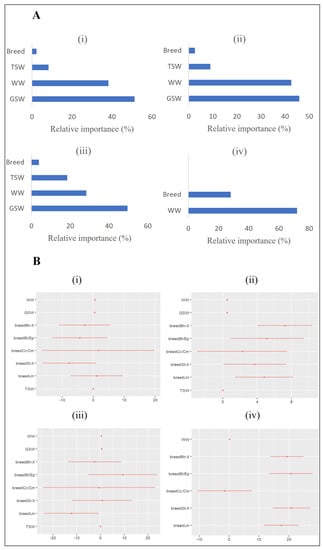 (A) Relative importance plots in the BRT model for 1 month before slaughter (i), 3 months before slaughter (ii), 9–10 months before slaughter (iii), and at weaning (iv). (B) Dot-and-Whisker plots of regression coefficients in the MLR model for 1 month before slaughter (i), 3 months before slaughter (ii), 9–10 months before slaughter (iii), and at weaning (iv).