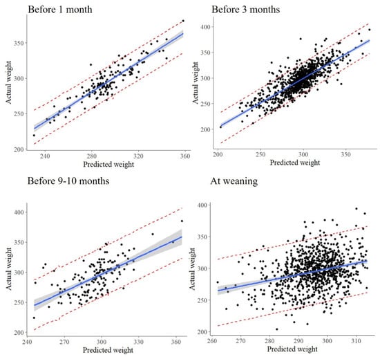 Overall, the outcomes with the two methods, the MLR and the BRT, were approximately similar. The predictive ability of the CW decreased when moving away from the slaughter. Both models predicted the CW with an approximately 3% average error (~8–12 kg) one month prior to slaughter, while the MAPE was 4% (~12–16 kg) when predicting three months prior to slaughter. The error increased considerably (MAPE—~6% and ~16–21 kg) for CW predictions at 9–10 months before slaughter. At weaning, the CW could be predicted with an average error of ~8% (~20–25 kg) using BW and breed only.
