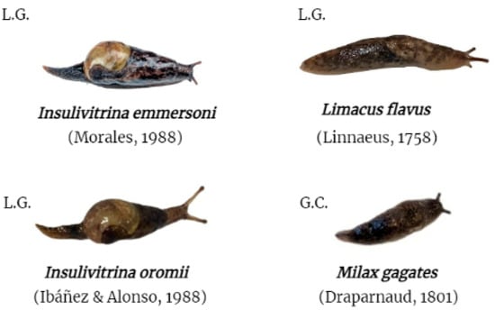 Further, terrestrial gastropods were collected from five municipalities in La Gomera and one in Gran Canaria (Figure 2 and Table 1 and Table 2). The collected terrestrial gastropods included the endemic species Insulivitrina emmersoni (28) and Insulivitrina oromii (8), present only on the island of La Gomera (Figure 2 and Table 1 and Table 2). On the other hand, Limacus flavus (10) and Milax gagates (24), possible native species to the Canary Islands, were collected on the islands of La Gomera and Gran Canaria, respectively (Figure 2 and Table 1 and Table 2). This field study was authorized by the “Consejería de Transición Ecológica, Lucha contra el Cambio Climático y Planificación Territorial” (Gobierno de Canarias) (Expte. 19-2022/1110092705). The capture of animals in protected areas (Garajonay National Park) was approved by “Cabildo Insular de La Gomera” (Expte. 4121/2022) and “Parque Nacional de Garajonay” (749.153, TELP/122.918).