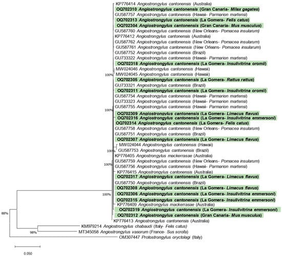 The BLAST analysis confirmed that the sequences obtained from all the hosts analyzed in this study showed 100% homology with A. cantonensis (Query Cover (Q.C.): 100%). With respect to the other Angiostrongylidae species, the BLAST analyses showed a lower identity: 84.8% with Angiostrongylus vasorum (Q.C.: 39%) and Angiostrongylus chabaudi (Q.C.: 40%) and 81% with Angiostrongylus abstrusus (Q.C.: 19%).