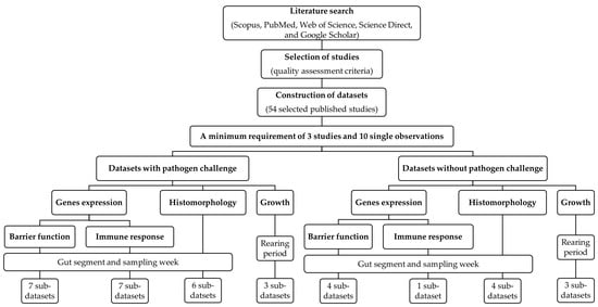 Two databases were constructed: one for data from research with pathogen challenge and the other for data from studies without pathogen challenge (Figure 1). The next step was to construct datasets for individual dependent variable categories separately for data with or without pathogen challenge, i.e., one dataset each for gut barrier and immune response-related gene expression, histomorphology measures (i.e., villus height, crypt depth, and villus height/crypt depth ratio), and growth performance (i.e., ADG, ADFI, and FCR). Datasets for gut barrier and immune-related gene expression and histomorphology were further subdivided; one sub-dataset was created for each gut segment. For each gut segment, the sub-sets were then grouped by age of the chicken. The dataset for growth performance was divided into sub-datasets based on the stage of the rearing period: starter (1–3 weeks), finisher (4–6 weeks), and overall (1–6 weeks) periods. As there were not enough studies available to investigate each probiotic strain or species separately, results for the various species/strains of probiotics were analyzed together in this meta-analysis. A reference list of the sub-datasets of broiler studies is presented in Table S1.