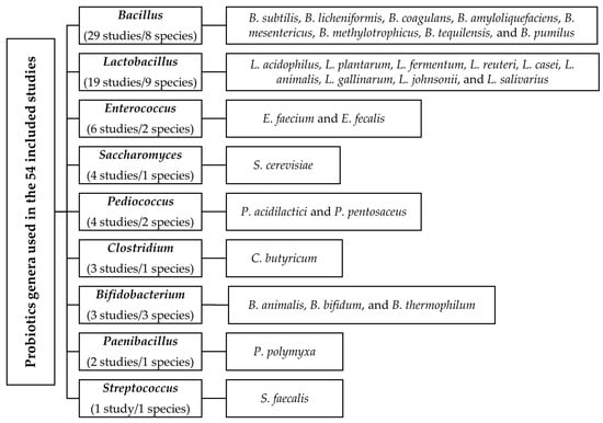 The main characteristics of the 54 studies that met the selection criteria are presented in Table S1. Of the 54 studies, 14 and 28 studies were without and with pathogen challenge, respectively, whereas 12 studies provided data for challenged and un-challenged conditions. Overall, nine different genera and various species within these genera were administrated as probiotics in the included studies (Figure 2): Bacillus (29 studies) and Lactobacillus (19 studies) were predominantly used, followed by Enterococcus (6 studies), Saccharomyces (4 studies), Pediococcus (4 studies), Clostridium (3 studies), Bifidobacterium (3 studies), Paenibacillus (2 studies), and Streptococcus (1 study). Eight different Bacillus species (B. subtilis, B. licheniformis, B. coagulans, B. amyloliquefaciens, B. mesentericus, B. methylotrophicus, B. tequilensis, and B. pumilus), nine species for Lactobacillus (L. acidophilus, L. plantarum, L. fermentum, L. reuteri, L. casei, L. animalis, L. gallinarum, L. johnsonii, and L. salivarius), three species for Bifidobacterium (B. animalis, B. bifidum, and B. thermophilum), two species each for Enterococcus and Pediococcus (E. faecium, E. fecalis, P. acidilactici, and P. pentosaceus), one species each for Clostridium, Streptococcus, Paenibacillus, and Saccharomyces (C. butyricum, S. faecalis, P. polymyxa, and S. cerevisiae) were administered. In addition, 36 studies used only one mono-species probiotic, 7 studies used more than one mono-species probiotic, 8 studies used multi-species probiotics, and 3 studies used both mono- and multi-species probiotics. The experimental diets were mainly composed of corn, wheat, barley, bran, rice, distiller grain, and sorghum, with soybean meal, fish meal, corn gluten meal, corn protein powder, rapeseed meal, peanut meal, and cottonseed meal as protein feedstuffs (Table S1). The experimental diets did not contain other bioactive compounds. Dietary ME/CP ratios were constant, with a mean of 0.6 and 0.7 for the starter and finisher diets, respectively, for the various response variables.