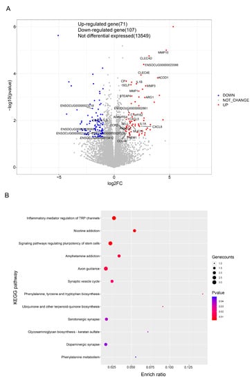 (A) DEG volcano maps of the LG and HG groups in the intestines of rabbits. The enriched KEGG pathways of (B) upregulated and (C) downregulated DEGs.