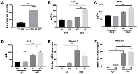 3.4. Impaired Intestinal Barrier Function in miR-199a Knockout Mice following DSS Treatment