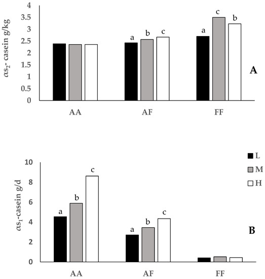 Interaction between the CSN1S1 genotype (AA, AF and FF) and diet (L, M and H) for the αs2-casein level (A) and αs1-casein yield (B). Values within genotypes with different superscript letters are significantly different (p < 0.05).