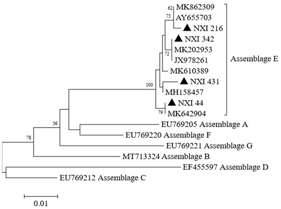 - Fu, Y.; Dong, H.; Bian, X.; Qin, Z.; Han, H.; Lang, J.; Zhang, J.; Zhao, G.; Li, J.; Zhang, L. Molecular characterizations of Giardia duodenalis based on multilocus genotyping in sheep, goats, and beef cattle in Southwest Inner Mongolia, China. Parasite 2022, 29, 33. [Google Scholar] [CrossRef]