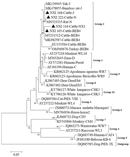 - Liu, Y.Y.; Qin, R.L.; Mei, J.J.; Zou, Y.; Zhang, Z.H.; Zheng, W.B.; Liu, Q.; Zhu, X.Q.; Gao, W.W.; Xie, S.C. Molecular detection and genotyping of Enterocytozoon bieneusi in beef cattle in Shanxi Province, North China. Animals 2022, 12, 2961. [Google Scholar] [CrossRef] [PubMed]