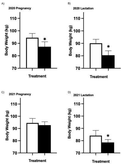 Comparative body weights of study ewes for both years. All untreated CON groups are represented in white, and treatment CVP groups are in black. Body weights for ewes CON (n = 13) or treated with CVP (n = 12) during pregnancy (A) and lactation (B) in YR1. Body weights for ewes, either CON (n = 8) or treated with CVP (n = 8), during pregnancy (C) and lactation (D) in YR2. Asterisk (*) represents p values < 0.001 relative to control on each figure. Error bars represent SEM.