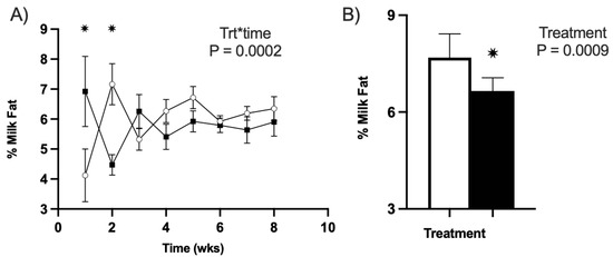 Milk fat percentages of study ewes for both years. All untreated CON groups are represented in white, and treatment CVP groups are in black. (A) Milk fat percentage within treatment over time for YR1 (* p < 0.005 versus CON within week). (B) Milk fat percentage between treatments for YR2 (* p = 0.0009 versus CON).