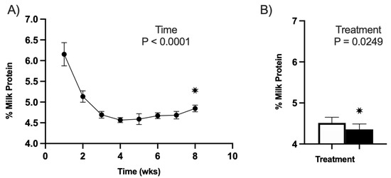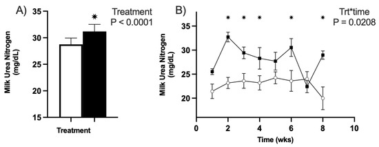 Milk urea nitrogen concentrations of all ewes used in trial. All untreated CON groups are represented in white, and treatment CVP groups are in black. (A) Milk urea nitrogen amounts between treatments for YR1. The effect of treatment was significant with a * p < 0.01 relative to the control group. (B) Milk urea nitrogen over time for YR2. There was a significance of treatment–time of * p < 0.05 with individual significance at weeks 2, 3, 4, 6, and 8 after birth, which are all marked with an asterisk. p values for individual weeks were all < 0.05.