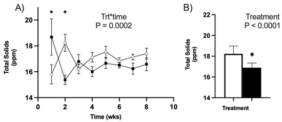 Milk total solids (TS) of all ewes used in trial. All untreated CON groups are represented in white, and treatment CVP groups are in black. (A) Milk TS over time for YR1. There was a significance of treatment–time of * p < 0.01 with individual significance at weeks 1 and 2 after birth, which are marked with an asterisk. (B) Milk TS between treatments for YR2. The effect of treatment was significant with a * p < 0.01 relative to CON.