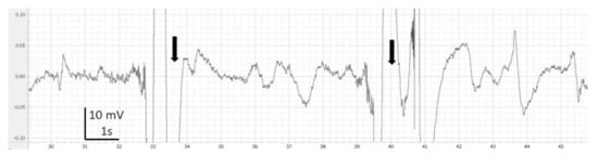 Example of baseline (normal EEG) observed in halibut before immersion in CO2-saturated seawater. Band pass filter (0.1–45 Hz). Arrows represent breathing interference.