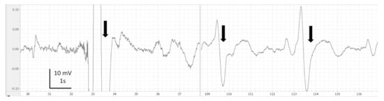Example of comparison of baseline (left side) vs. suppressed phase (right side) observed in halibut from immersion in CO2-saturated seawater. Band pass filter (0.1–45 Hz). Arrows represent breathing interference.