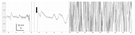 The iso-electric phase was observed after bleeding (Figure 5). This phase corresponds to low-level noise reflecting a lack of EEG activity as was noted in broilers under low-atmospheric-pressure stunning [25] and during exposure to gas mixtures [42]. The iso-electric phase, in conjunction with other indicators such as the absence of reflexes and cardiac arrest, are indicators of brain death in birds under anaesthesia [17]. High concentrations of CO2 in the brain, in addition to hypovolemia and ischemia caused by cutting the gills, suggest that the iso-electric phase is an indicator of brain death.