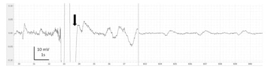 Regarding Ptot, we did not observe significant differences among the baseline and suppressed phases; the difference was observed at the iso-electrical phase. In rainbow trout (Oncorhynchus mykiss) submerged in CO2 at pH < 5.0 and 10 °C, EEG signal amplitude (Ptot) increased immediately after transfer to the treatment tank compared to pre-treatment amplitude measurements. Time until amplitude declined to <50% pre-treatment amplitude was 7.44 (4–15) min after transfer [35].