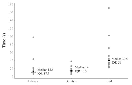 Individual time (s) for escape attempts from immersion in CO2-saturated seawater. Latency for first movement, duration of movements and end of last movement. The green point indicates individual values; the black points represent the median value. Interquartile range IQR.