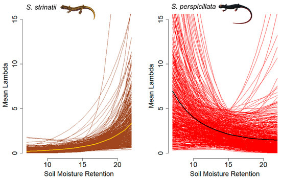 Plots showing the effect of the soil moisture retention potential (MOIST) on salamander abundance: Speleomantes strinatii on the left and Salamandrina perspicillata on the right. Bold lines represent the posterior mean, while the thin lines represent 500 random draws from the posterior distribution.