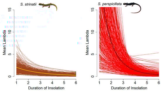 Plots showing the effect of duration of direct insolation (INSOL) on salamander abundance: Speleomantes strinatii on the left and Salamandrina perspicillata on the right. Bold lines represent the posterior mean, while the thin lines represent 500 random draws from the posterior distribution.