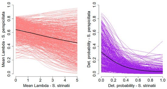 During our sampling, we counted 96 salamanders: 61 S. strinatii and 35 S. perspicillata. For both species, the co-abundance N-mixture model was in a good fit (posterior predictive checks: Bayesian p-value for S. strinatii = 0.46, and for S. perspicillata = 0.51). For all monitored parameters, convergence resulted successful (maximum R-hat = 1.059). The complete list of parameters’ estimates, along with their respective 90% CRI, for both species, is reported in Table 1.