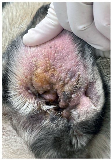 The prevalence of dermatological abnormalities in brachycephalic dogs ranges from 10% to almost 30%, depending on breed and geographic origin [6,7]. Genetic, autoimmune, and parasitic diseases, immune deficiencies, vasculitis, allergies, secondary infections, otitis externa and media, claw and anal sac diseases, skin folding, alopecia, and pruritus have all been recognized as problems in brachycephalic dog breeds [8,9,10]. Genetic aspects, skull conformation, pressure changes between the middle ear and nasopharynx, skin folding, environmental factors, and the microbiome composition may all contribute to the aetiopathogenesis of dermatological diseases in brachycephalic dogs [5,11].